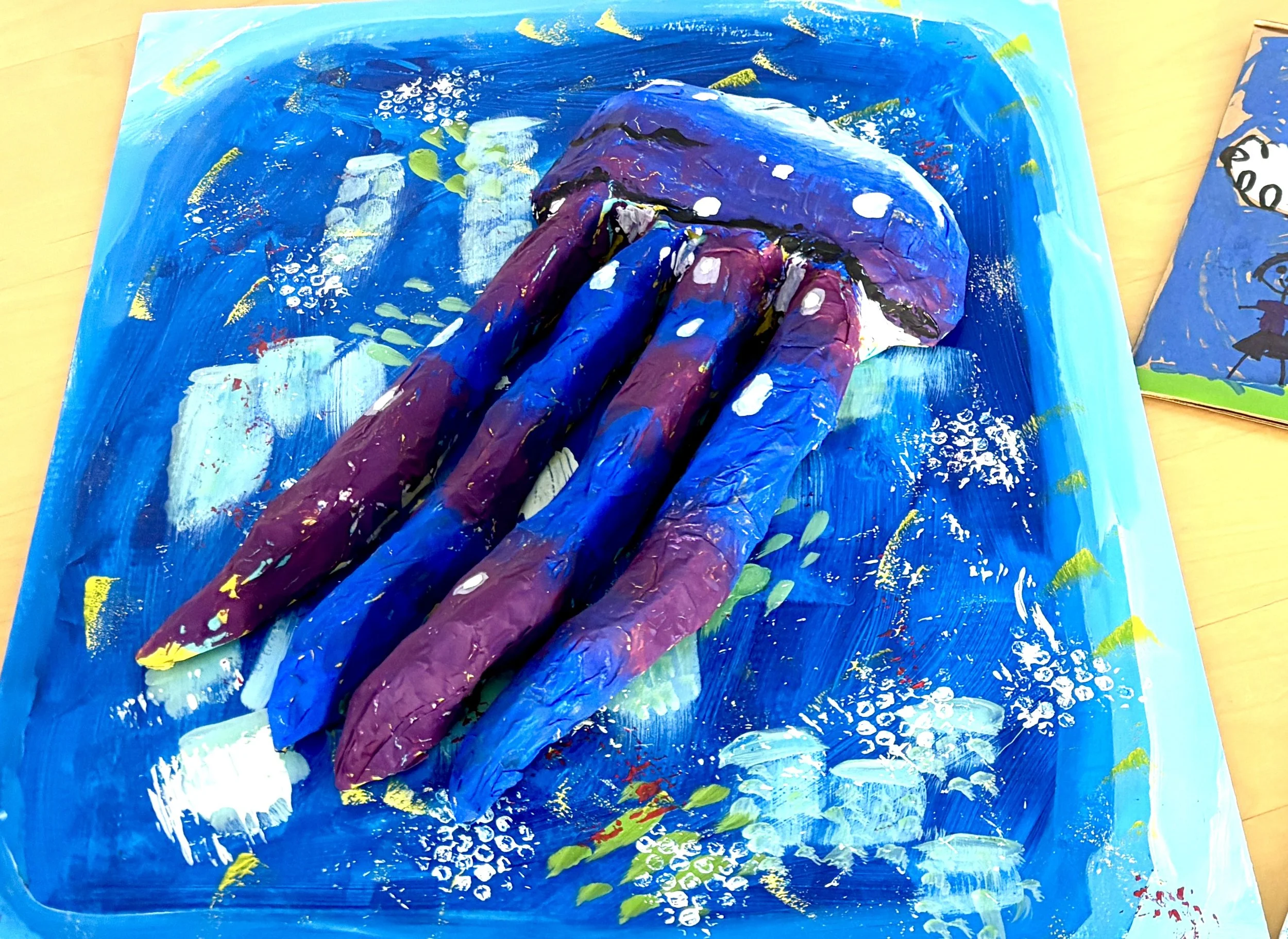 Every artist will choose an ocean creature and turn it into a paper mache sculpture. We will create a background using abstract painting and printing techniques to showcase our sculpture in its ocean environment. At the end of the class, all students will be able to name and describe their ocean creature in German.